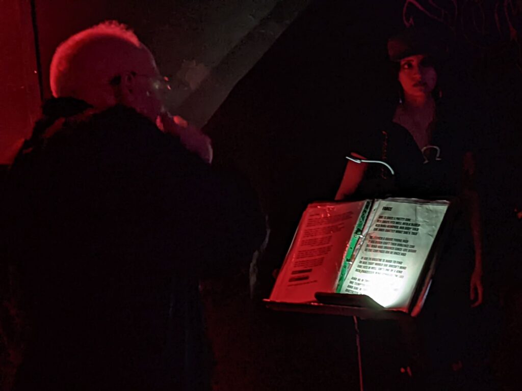 Ro and Steve kicked things off for its Brighton premiere, riffing up the anticipatory fabric that Melissa promptly tore through with a scream before she snarled out the story of the “spawn of slut and abattoir semen” in a manner that’d make Sade squirm. As on disc, she sold the build-up to the little fucker’s depraved emergence “on a gust of vaginal breath”, with the slow, portentous riffage framing her account of him “tast[ing] the cunt of the cunt” who birthed him; Dan’s infectious drum-in then kicked off the gang-chant refrain that makes this track especially memorable, hitting harder this time as Melissa swung the mic my way for the first couple of cycles. She then gave a cycle to another at the front before pulling the mic back for the remaining chants: