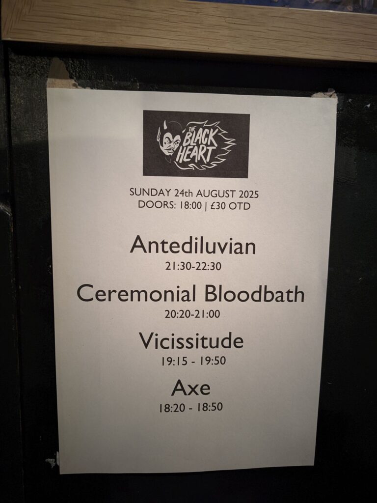 Morbid Angle events always, at least, ping my curiosity radar, and their late-August four-band bill, featuring esoteric Canadian blackened-death dealers Antediluvian as the headline act, maintained that pattern. Though the names on the bill were initially unfamiliar to me, a listen or two to each of them, plus the gig taking place on Bank Holiday Sunday, had me thinking it was worth booking the night off for at least half the line-up, even if my initial reaction to hearing the headline act was “What the fuck’s this!?”