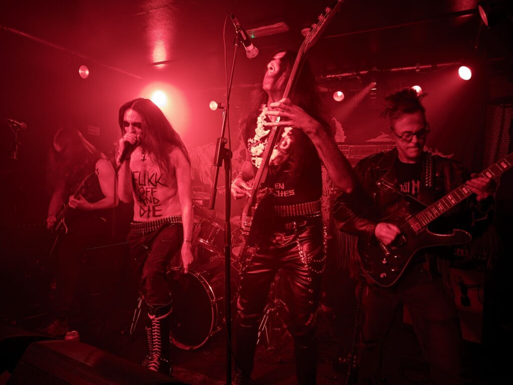 My reaction was less adverse when I first listened to Äxe, the opening act of the night. Indeed, I’d been so impressed by their output, in its gravelly, crust-laden blackened thrashiness, that I’d ordered their Warriors of the Death Raid demo on CD months prior. Their live set maintained the goodwill established by their studio output, with the London-based band delivering a memorable evening-opening onslaught. Vocalist Neheroth, “FUKK OFF AND DIE” scrawled across his chest, barked and growled like a feral, apocalyptic attack dog whilst his riff ‘n’ rhythm section smashed and shredded away under the ever-altering lighting; together, their combined efforts throughout tracks like ‘Face the Grave’, ‘Bleeding Cross’, and the ever chantable ‘No False’ amounted to the aural, Anglophone equivalent of those charming spaghetti wasteland Mad Max homages, the instrumental grit and grime bringing to mind the fuzz of a constantly rewound VHS tape.