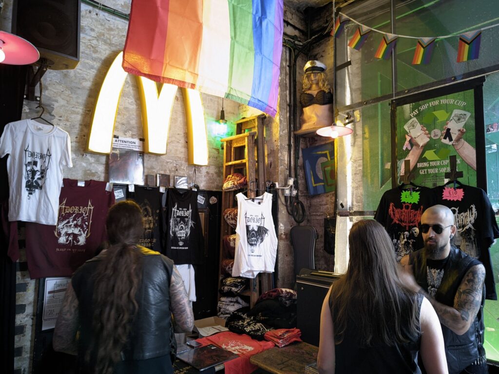 Come the day, getting to the venue proved to be a piece of piss, having taken a gander at it on the way to see Gary Numan a couple of months prior. Located below and behind the train station, The Green Door Store had something of a quirky, rickety youth-centre vibe to it, complete with kitschy decor, rainbow flags, and gender-neutral bogs plastered with old-school graffiti and the latest in ideological crusades, parking it firmly in the 2020s—#TurfTheTERFBigot!