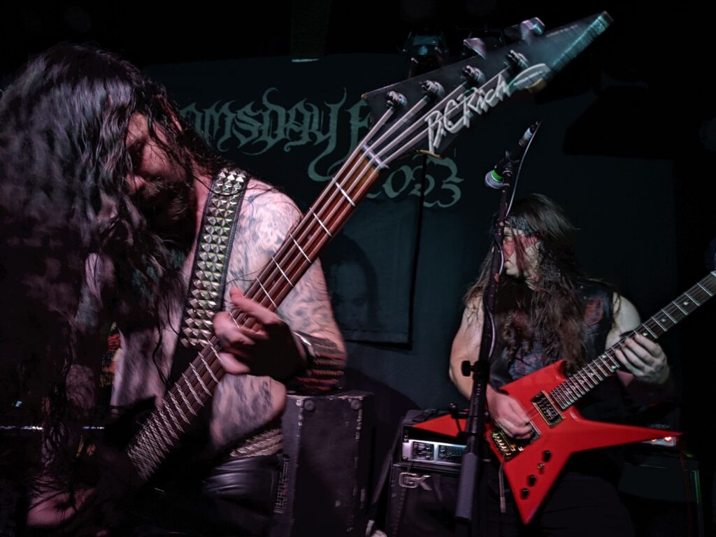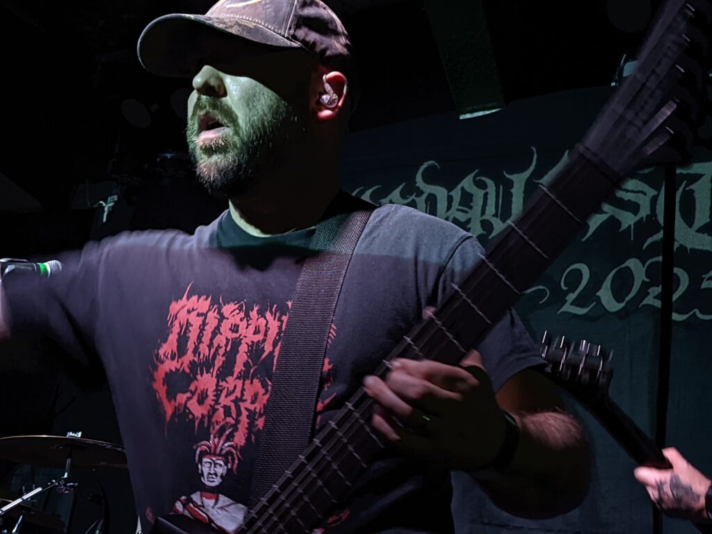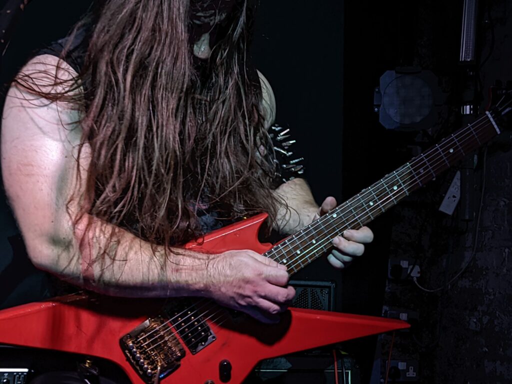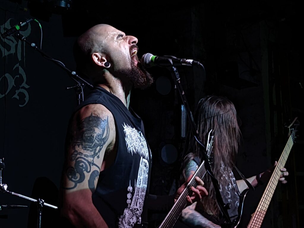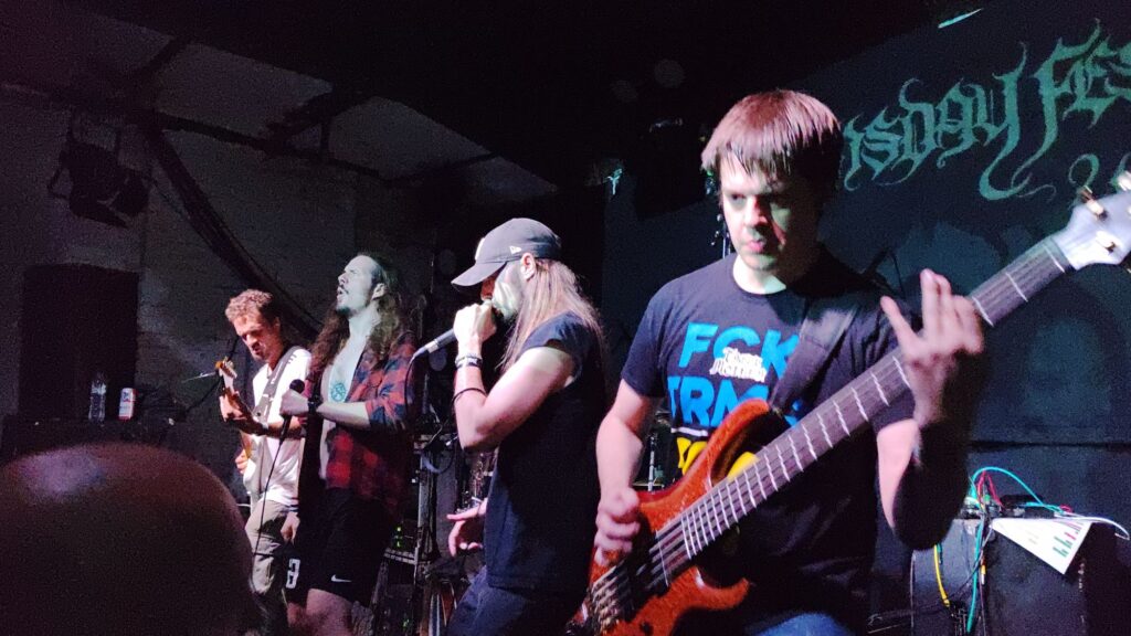 Cambridge chunder merchants Celestial Sanctuary stepped up next, their chunky, pounding riffage kicking off the first moshpits of the day. Vocalist–guitarist Thomas Cronin also made a point of barking the crowd awake, even throwing me a fistbump at one point — can’t fault the energy! That said, their stuff plays in the lane of what I like to call “dull-bludgeon death metal”: the kind of DM that struggles to keep a grip on me, too light on memorable hooks, shapely riffs, or any ritual texture, occasional standouts like ‘Trapped Within the Rank Membrane‘ aside. Seeing them a third time only reinforced that view.