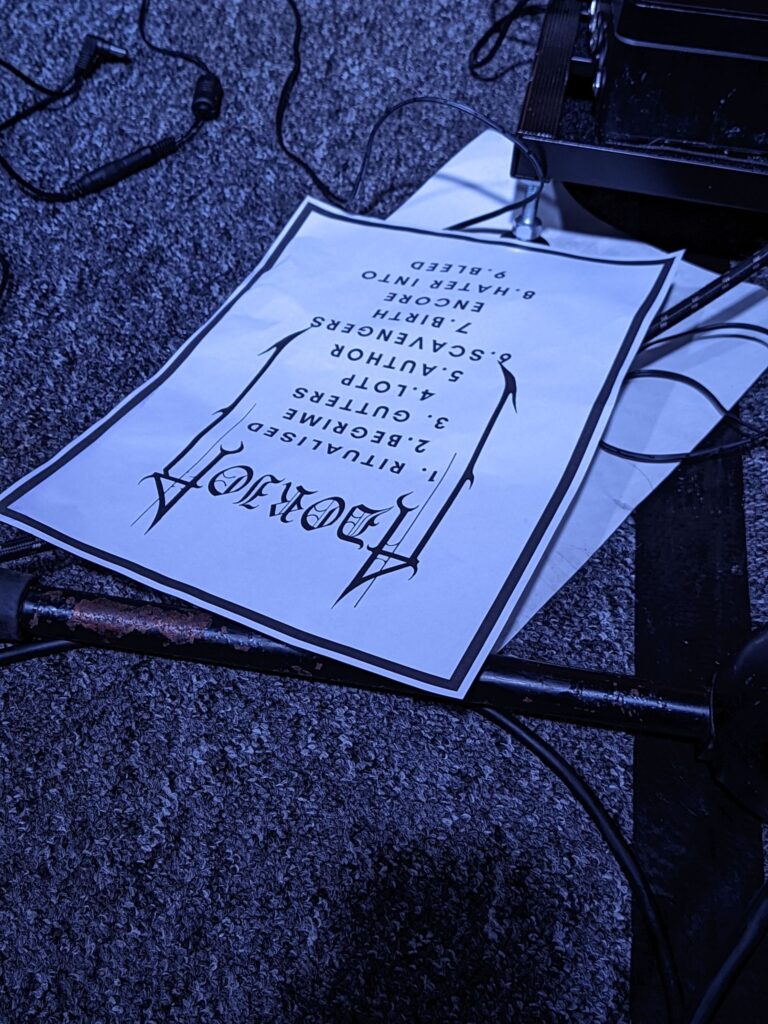 Turnout-wise, I was surprised and disappointed by the dearth of “the London crew” — recognisable regulars — among the attendees. I knew the Necro Ritual lads had their own headline slot in Hungary that night, but most of the others who sounded like they were gonna make it just…didn’t. The only familiar face in the crowd was a Brightoner who frequents a fair few London shows. On the personnel side of things, I saw various members of the billed bands milling about or manning stands, including, in Adorior’s case, bassist Tom (TNT Tank) and axeman Steve (Stevil Offender, also the mastermind behind Qrixkuor). A chat with Steve confirmed what I’d already guessed: Melissa, drummer Dan (D. Molestör), and guitarist Ro (Ro) were off elsewhere. I figured they’d all show up…whenever.
