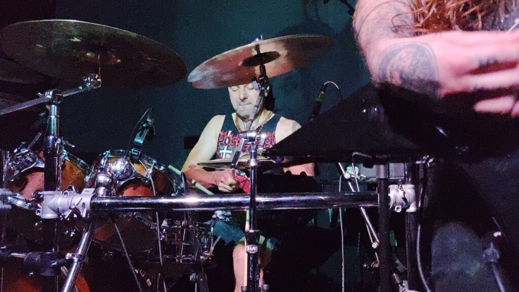 Following a drum-key mishap, the engines revved up again for Bleed‘s heralding single ‘Scavengers of Vengeance’, a whirlwind ride along the blackened junction of death and thrash, with “pentagrams of petrol burning hot” lighting the path to retribution. Performance-wise, it brought out the best in the band, with Ro especially losing himself in the frenzy and Tom, their self-described “dirty shirtless animal”, adding a procession of hails at key points. Melissa and I shared a lyrically appropriate “stinging” fistbump as she tore through a tale of “teeth kicked out”, eyes “beaten SHUT” (a recurring Bleed motif), and “wonder stolen, broken, soiled”, its protagonist denied release and resolution even as its galloping stampede of a riff — earlier interrupted by design in an act of aural edging — is allowed to play out the song in full.