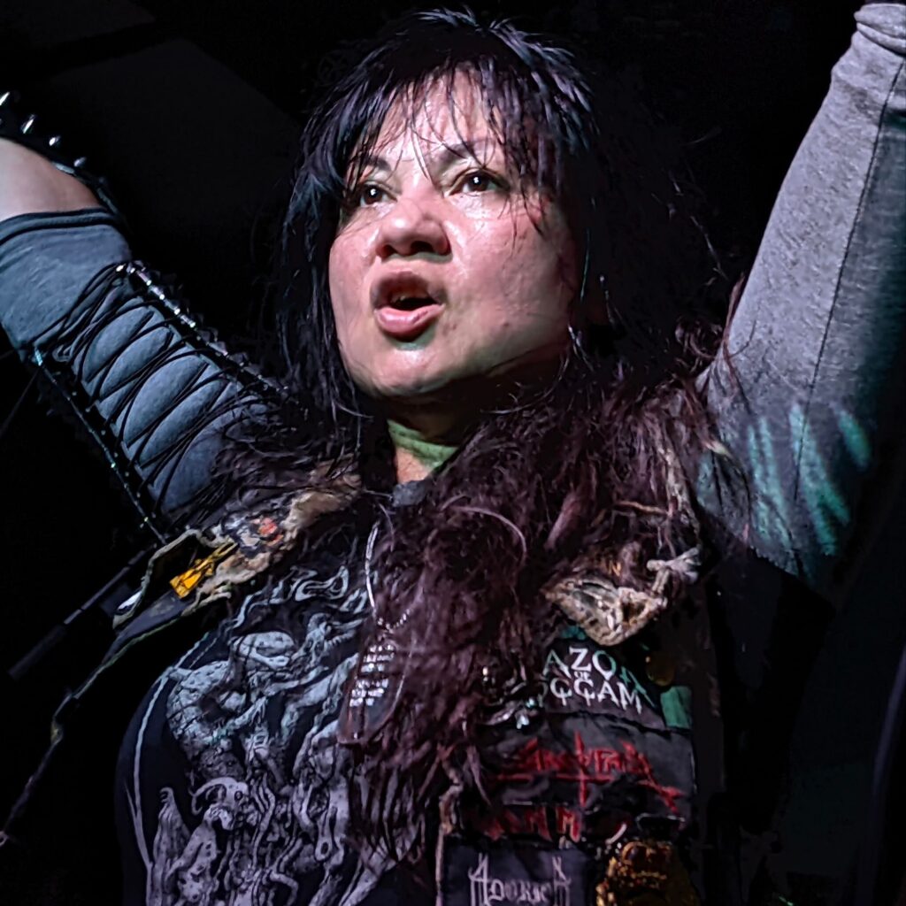 Growling “GET DOWN THE FUCKING FRONT!” through jaded lungs at those furthest from the stage, Melissa introduced the band, who launched straight into ‘Ritualised Combat (Sin, Sin, Sin)‘, the second track from their much-lauded sophomore album, Author of Incest. Snarled descriptions of burning messiahs, scraping skins for dancing in, and Christridden whores getting their faces caved in rode on a wave of careering guitars and undergirding drumwork, Melissa thrusting her mic at the front row to catch the errant cries of “HAIL! HAIL! HAIL SATAN!”, bolstering her bandmates’ own bellows. As the song neared its end, she rose in coiled fashion to survey her prey; the instrumentals gave way, leaving only the squeal of Ro’s guitar, offering her a pocket to address the “morsels to [her] altar”: