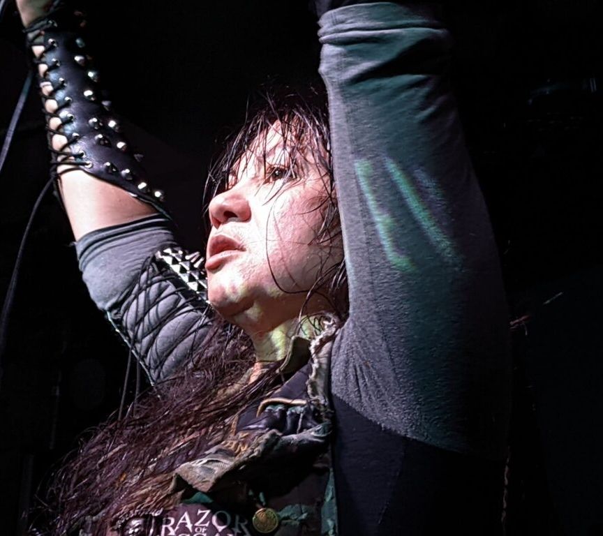 And, make no mistake, the band were in attack mode on hitherto unclaimed terrain, Melissa bearing down on the audience like a feral war priestess, all death glares, gritted teeth, matted mane, and a choice line in taunts: “What’s the matter? Are you afraid of me? You should be.” Given this, and given that Adorior dub themselves “fist metal”, with her as the onstage focal point, ritual commander, co-founder, and the main creative axis, how the fuck could I not nickname her “(the) Fistress”?